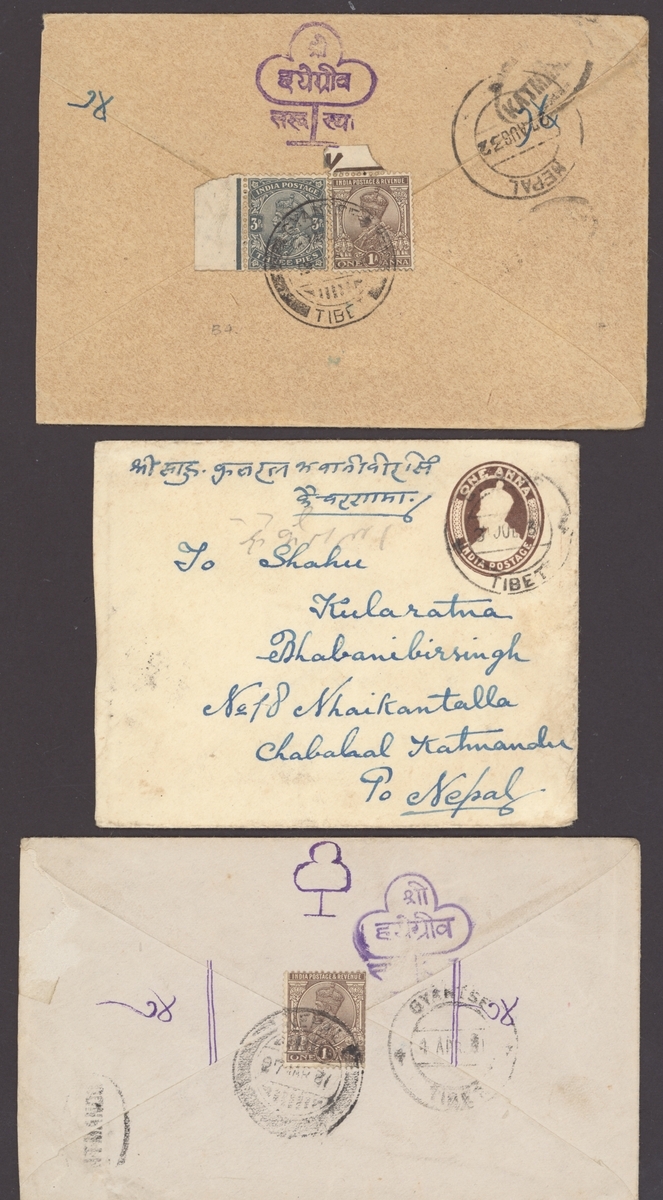 1931-32 three covers from the same merchant company with 1932 (19 Aug.) printed envelope from Lhasa to Katmandu bearing, on the reverse, India K.G.V 3p. and 1a. tied by Gyantse type B4 c.d.s. with Nepal arrival (27.8) and Katmandu in oval and handstruck merchant's device; 1931 (3 July) India 1a. postal stationery envelope cancelled type B3 c.d.s. and with the same backstamps; 1931 (27 Mar.) envelope to Lhasa bearing, on the reverse, India K.G.V 1a. tied by the large Nepal c.d.s. with Katmandu in oval and Gyantse type B3 (4.4) transit alongside. (3 covers)
