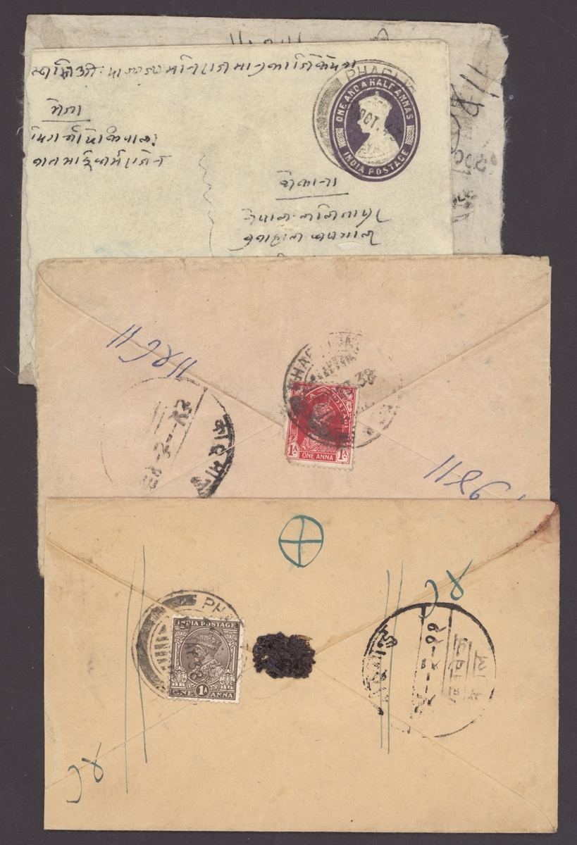 1933 two covers to Nepal with (6 Jan.) envelope to Patan "Via Raxaul" bearing, on the reverse, India K.G.V 1a.3p. tied by Gyantse type B3 c.d.s. with Nepal arrival (9.1) and Katmandu in oval alongside; (27 June) envelope from Lhasa to Katmandu bearing India K.G.V 3p. and 1a. tied by type B4 c.d.s. with Katmandu in oval alongside; also 1927 (8 Sept.) envelope to Katmandu with India 1a. tied by type B3 c.d.s. with appropriate arrival marks (stained one side). (3 covers)