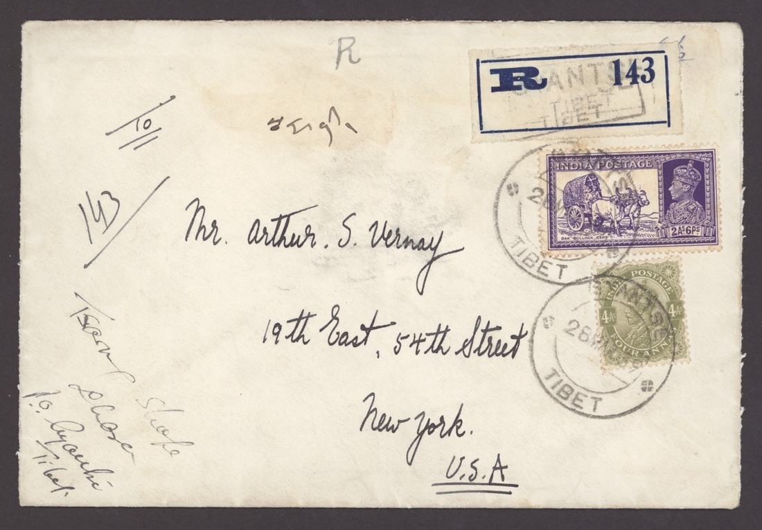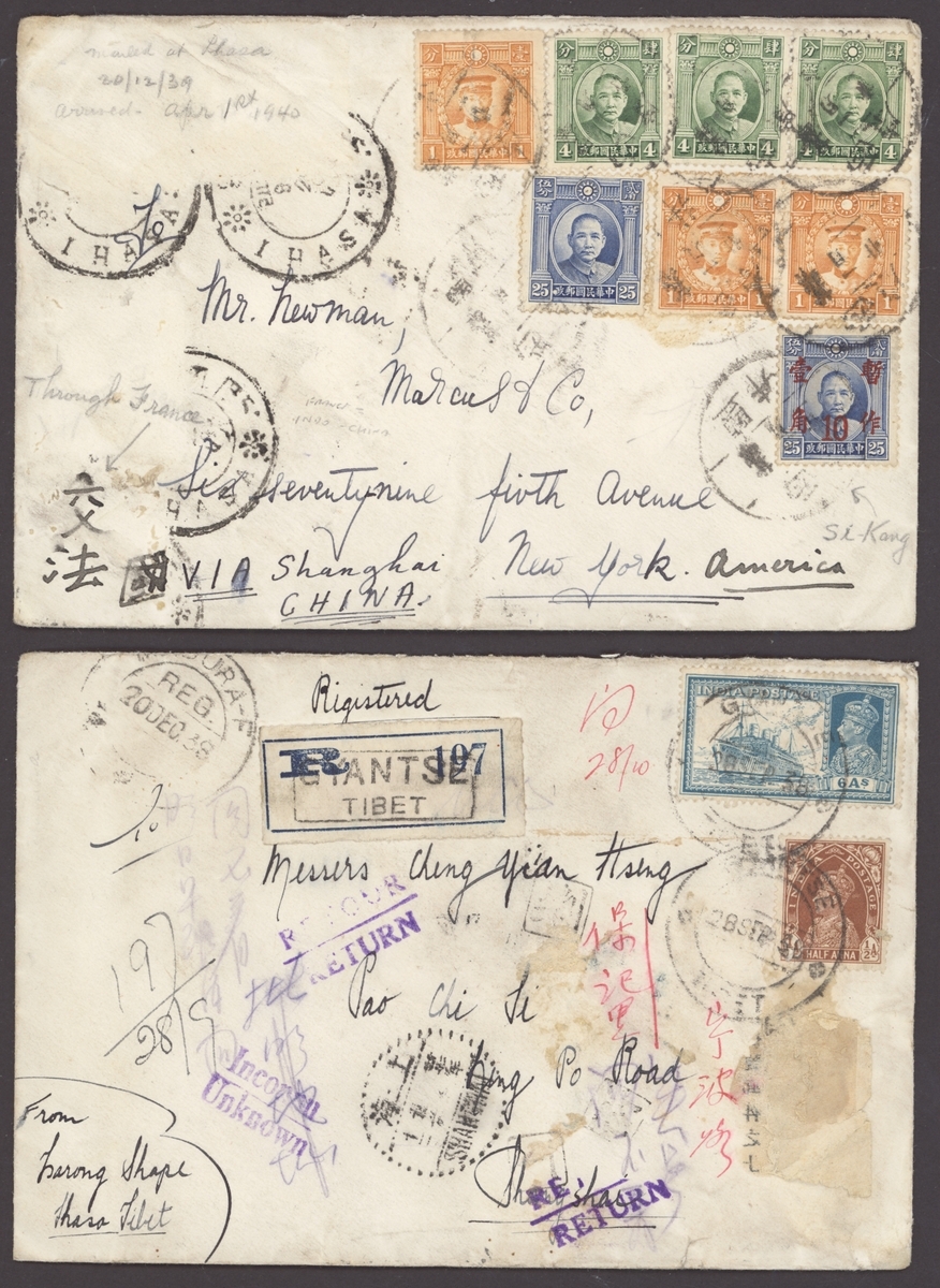 1938-40 three envelopes from Tsarong Shape in Lhasa with his device printed on the flap with 1938 (28 Sept.) envelope registered to Shanghai bearing India 6½a. franking tied by type B5 c.d.s. with type GE registration label, returned to sender with numerous transit marks via Madras and with return c.d.s. (31.12); (28 May) envelope registered to New York with India 6½a. franking tied by type B5 c.d.s. with type GE registration label with New York arrival (28.4) on the reverse. There is also 1940 envelope to New York, the three Tibetan adhesives have been washed off but were tied by Lhasa postmarks, with China 50c. franking tied by Si-kang c.d.s. and sent via Kunming and Hanoi with an array of backstamps. (3 covers)