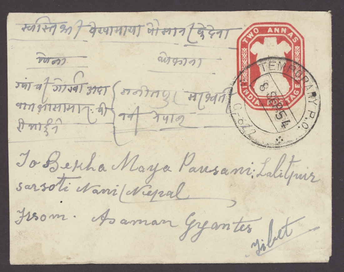 Temporary P.O C-622: 1954 (8 Sept.) India 2a. stationery envelope to Nepal cancelled by a superb strike of the large, double-circle datestamp, with indistinct arrival backstamp. Attractive