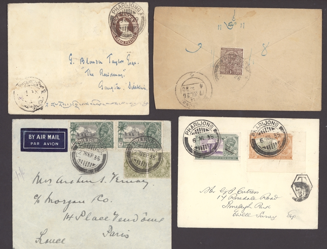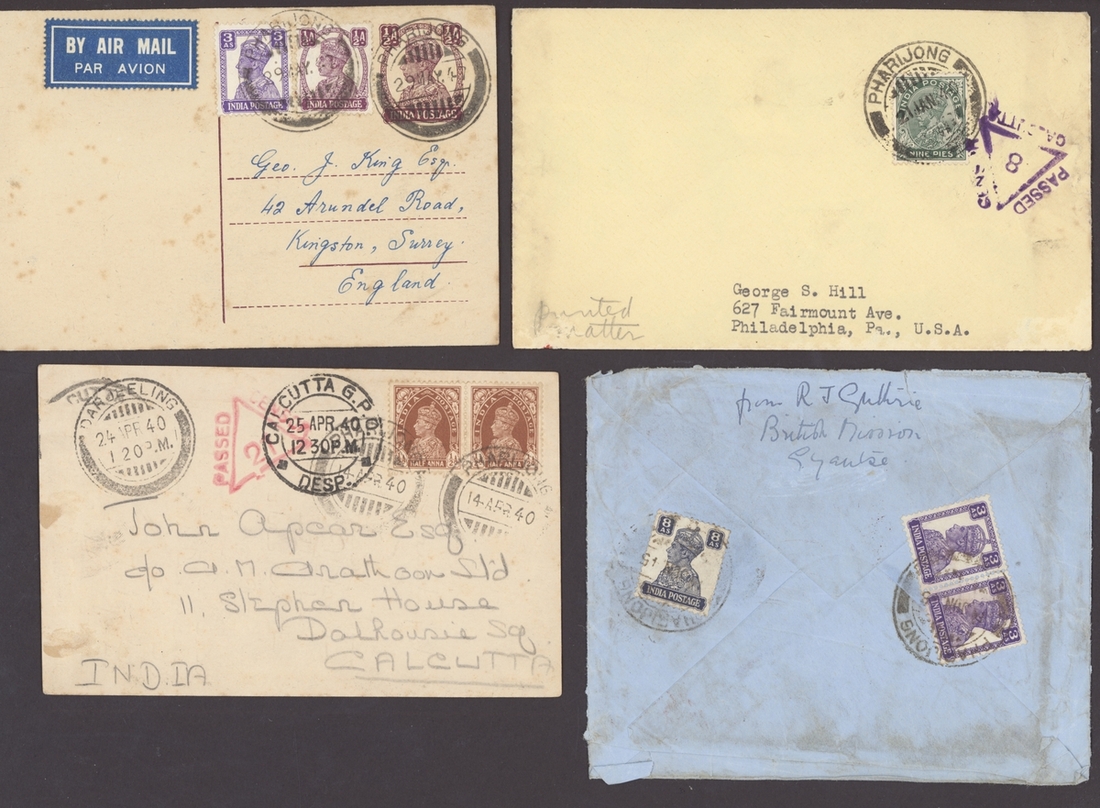 1925-47, a group of covers and cards bearing India frankings cancelled by type B4 c.d.s., includes 1929 1a. stationery envelope with additional Phari fretwork postmarks, cancelled tax handstamp, Calcutta censor handstamps (2), 14a. air envelope. (8 covers)