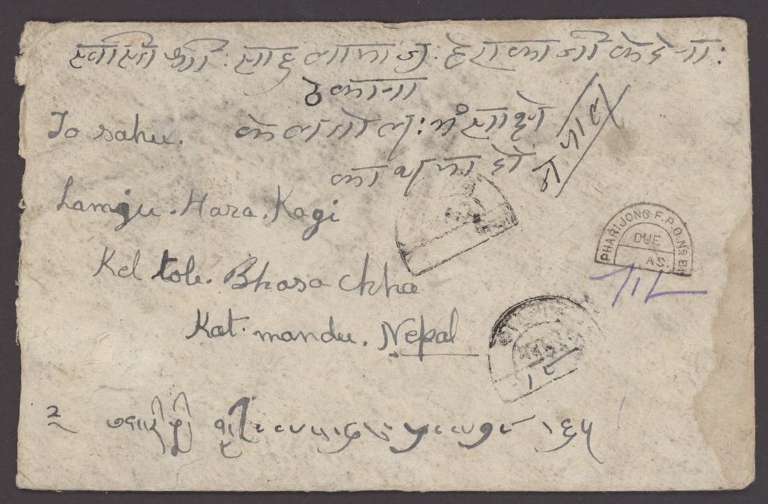 1949 (7 Aug.) (?) merchant's envelope from Pharijong to Katmandu bearing, on the reverse, Gandhi 1½a. (cover faults) tied by Pharijong Darjeeling machine postmark, the address side with a fine strike of horseshoe "