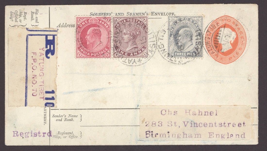 1913 (6 Nov.) 9p. Soldiers' and Seamen's Envelope registered to Birmingham, uprated India Q.V. 1a. and K.E.VII 3p., ½a. and 1a. tied by "