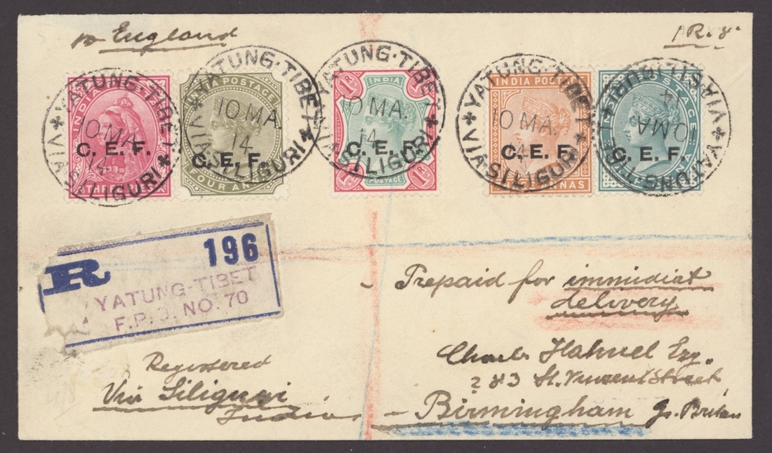 1914 (10 May) envelope registered to Birmingham bearing Q.V. "C.E.F." values to 1r. tied by Yatung Tibet type B1 c.d.s. with the type YC "