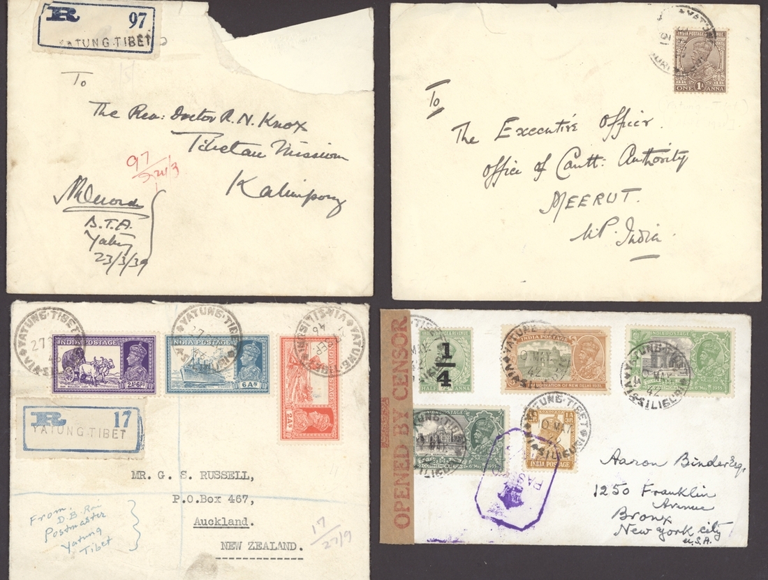 1931-47, a group of covers cancelled by the type B1 postmark with 1931 K.G.V 1a. franking to Meerut on British Trade Agency envelope (also 1939 a similar envelope registered to Kalimpong but with the adhesives torn off), 1942 multiple franked envelope to New York with censor seal and handstamp, 1946 10½a. franked envelope registered to New Zealand from the postmaster with type YF registration label, 1947 1r.4½a, franked envelope registered to Lhasa with manuscript registration and type YF label, sent by the postmaster. Some late dates of use. (5 covers)