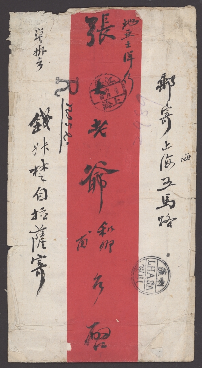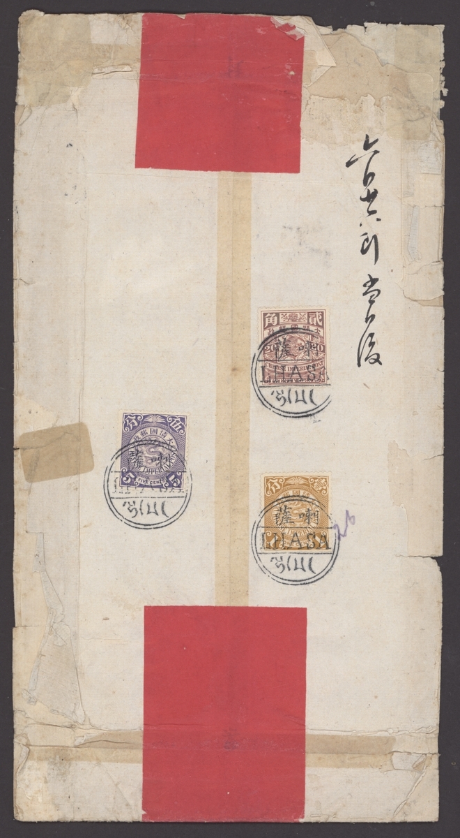 1910 (20 July) large red band envelope registered to Shanghai bearing, on the reverse, C.I.P. 1c., 5c. and 20c. tied by superb strikes of the type C1 postmark, there is a further strike on the address side along with Lhasa "R" (type CR1) with manuscript "no52." in black ink and Shanghai arrival c.d.s. (14th day 6th month); some wearing around the edges. An important and highly desirable cover used during the 2c. letter-rate period (until 5th August). Photo