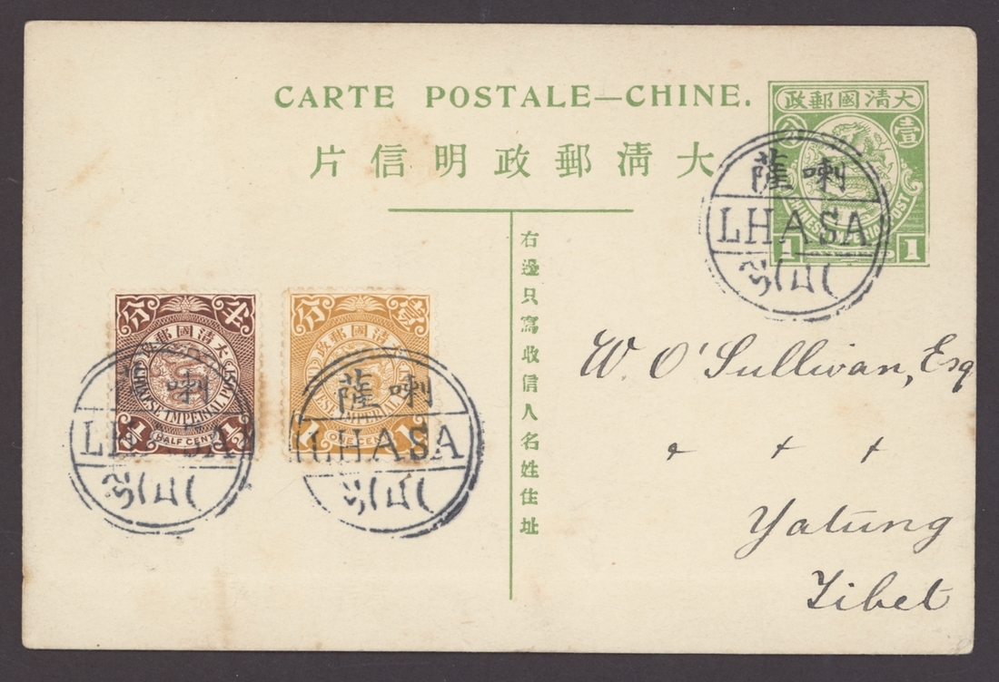 1910 (c.) C.I.P. 1c. postal stationery card to Yatung, uprated with C.I.P. ½c. and 1c., each cancelled by fine strikes of the type C1 postmark, the reverse side with a printed, tinted photograph marked "Lung Wang Yang, Lhasa". A rare and important example of the Coiling Dragon postal stationery card used in Tibet, only about a dozen of these cards have been recorded. Photo