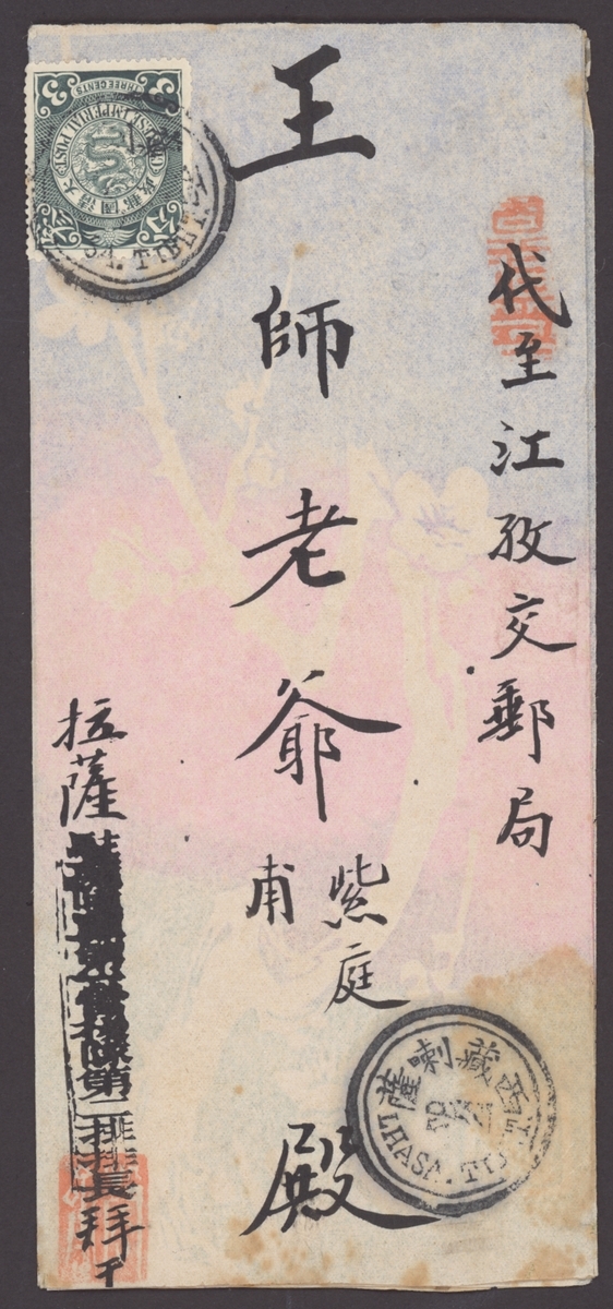 1910 (c.) Chinese internally illustrated envelope (opened-out) to Gyantse bearing C.I.P. 3c. grey-blue tied by a fine strike of the type C2 postmark with a second, superb strike at foot, the reverse bearing a superb strike of the Gyantse type C1 postmark. A fine and attractive cover. Photo