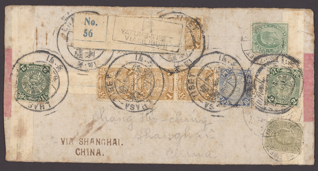 1911 (4 Mar.) opened-out red band envelope registered to Shanghai bearing, on the reverse, C.I.P. 1c. (6), 2c. (2) and 10c. tied by type C4 Dollar dater, with India K.E.VII ½a. and 4a. tied by "