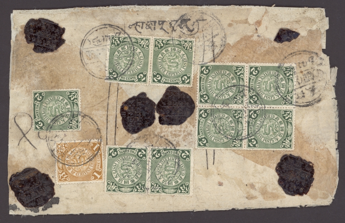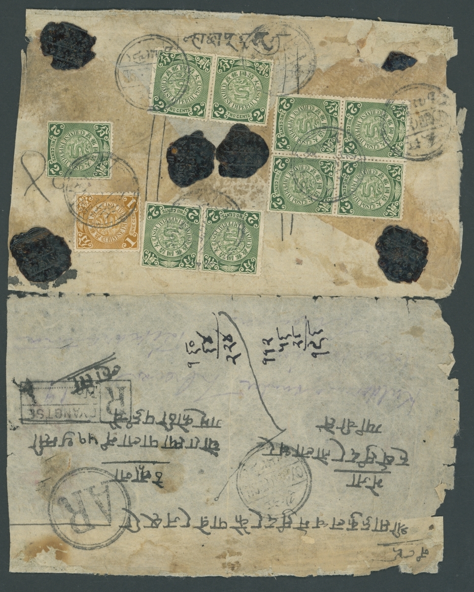 1910-11 (c.) opened-out native envelope double registered to Lhasa bearing, on the reverse, C.I.P. 1c. and 2c. (9) tied by fair strikes of the type C1 postmark, with six red wax seals, there is a further strike of the despatch postmark on the address side along with fine strikes of the type CR1 registered handstamp and large "AR" in double-circle type CR3. Some edge wear, an important cover. Photo