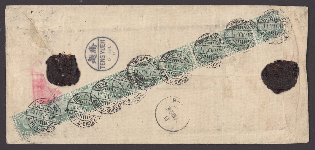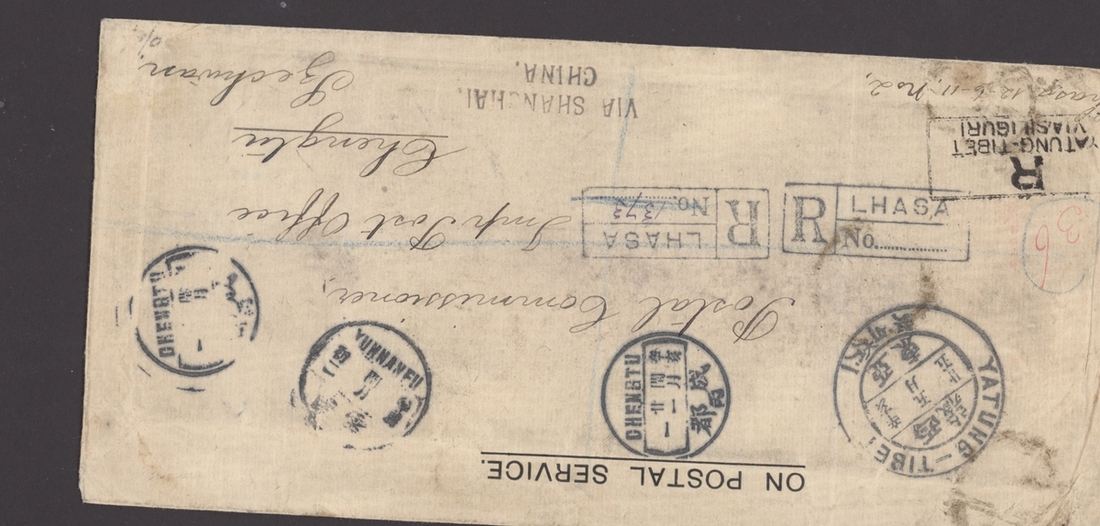 The Sea Route Via India: 1911 (12 June) On Postal Service envelope to Chengtu "via Shanghai, China" bearing two fine strikes of the Lhasa registration handstamp type CR3 along with Yatung-Tibet dollar dater type C3, "