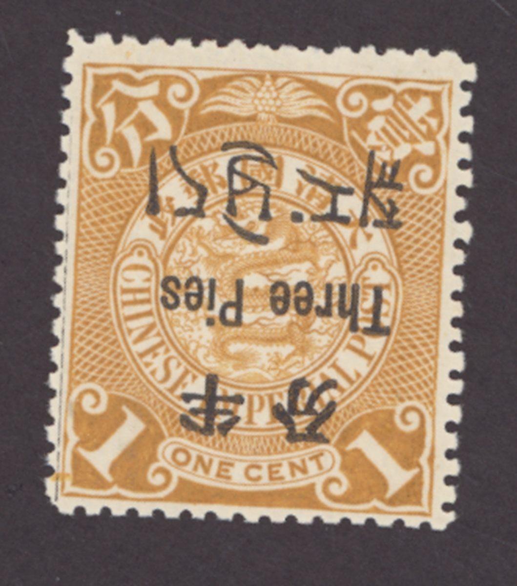 3p. on 1c. brownish orange variety surcharge inverted, sheet 2, right pane [16], part original gum, typically dried. Wide perforations at right from the edge of the sheet. Photo