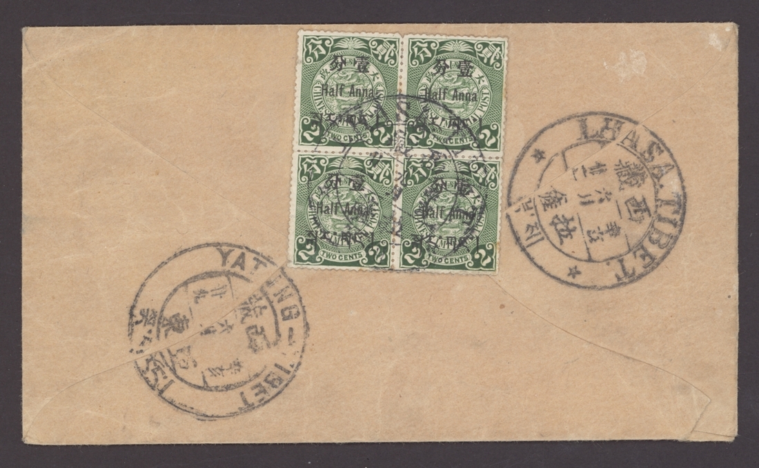 1911 (17 July) envelope to Yatung bearing, on the reverse, ½a. on 2c. block of four cancelled by Lhasa Dollar dater type C4 with a second strike alongside and similar Yatung arrival. A good multiple. Photo