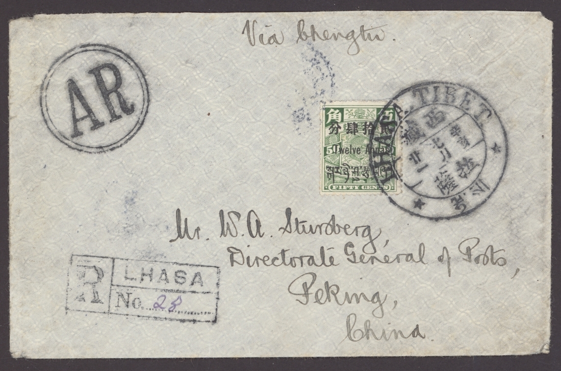 1911 (13 Sept.) Stursberg envelope double registered to Peking "Via Chengtu" bearing 12a. on 50c. well tied by a fine strike of Lhasa Dollar dater type C4 with fine strikes of the registered handstamp and large "AR" in double-circle, Chinese transit c.d.s. on the reverse with Batang (4.10), Tatsienlu, Yachow and Peking arrival (13.2). A good cover carried on the Tibet - Szechuan overland route, it is thought that there are less than ten covers carried on this route, all from the same correspondence. Photo
