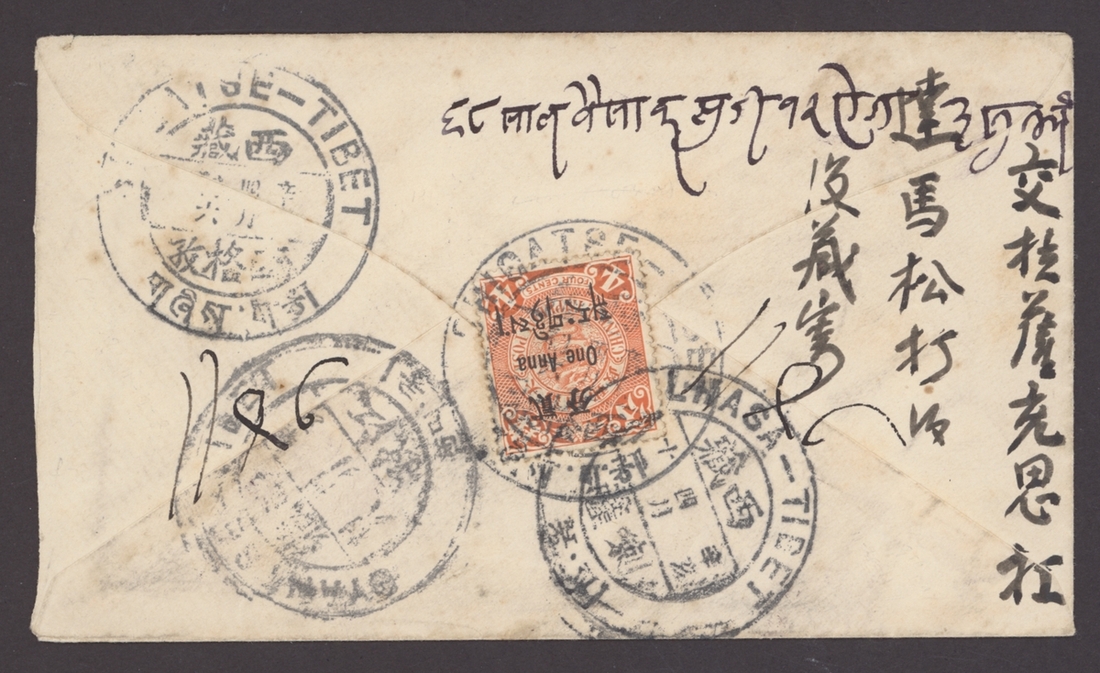 1911 (4 May) envelope to Lhasa bearing, on the reverse, 1a. on 4c. tied by Dollar dater type C3 with a second strike alongside plus similar for Gyantse and Lhasa; an attractive cover. Photo