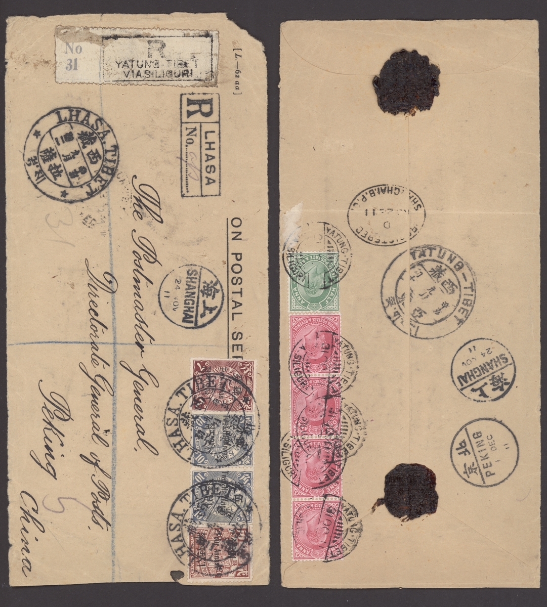 1911 (25 Aug.) the back and front of two On Postal Service envelopes to Peking; the address front with 2a. on 7c. (2) and 2½a. on 10c. (2) tied by fine strikes of the Lhasa Dollar dater type C4, a second strike at left, registered handstamp type CR3, Yatung-Tibet registration label and Shanghai bilingual c.d.s. (24.11), the reverse side bearing India K.E.VII ½a. and 1a. (4) tied by Yatung-Tibet type B2 c.d.s., Yatung-Tibet Dollar dater alongside, Shanghai British Post Office registered oval, Shanghai bilingual c.d.s. (24.11) and Peking arrival (1.12). Interesting pieces, not necessarily from the same cover. Photo