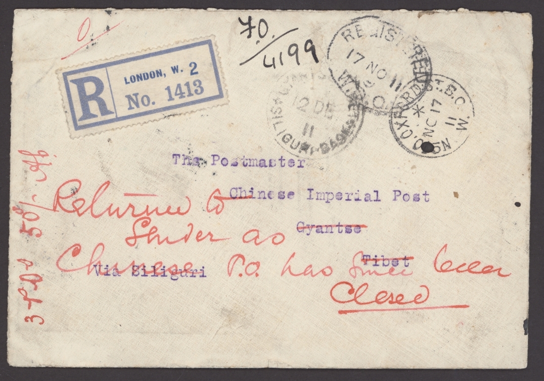 1911 (17 Nov.) envelope from London registered to the Postmaster, Gyantse bearing, on the reverse, G.B. K.E.VII 3d. tied by Oxford St. c.d.s., London registered oval, several Calcutta and Bombay D.L.O. datestamps, "