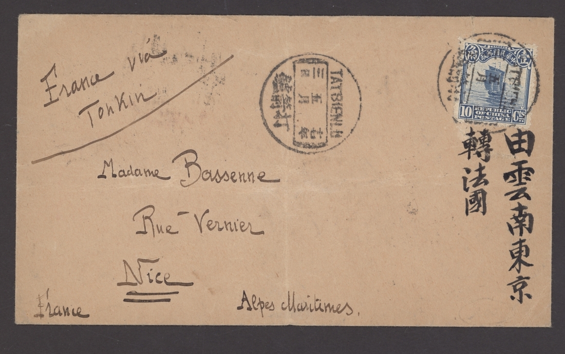 Tatsinlu: 1928 (3 May) envelope from a Catholic Mission to Nice, "France via Tonkin" bearing 10c. Junk tied by a good strike of the Tatsienlu English/Chinese lunar dater type 3a with a better strike alongside, good transit marks on the reverse with Hanyuanchang (7.5), Hweilichow (22.5), Yunnanfu (2.6); folding creases. Photo