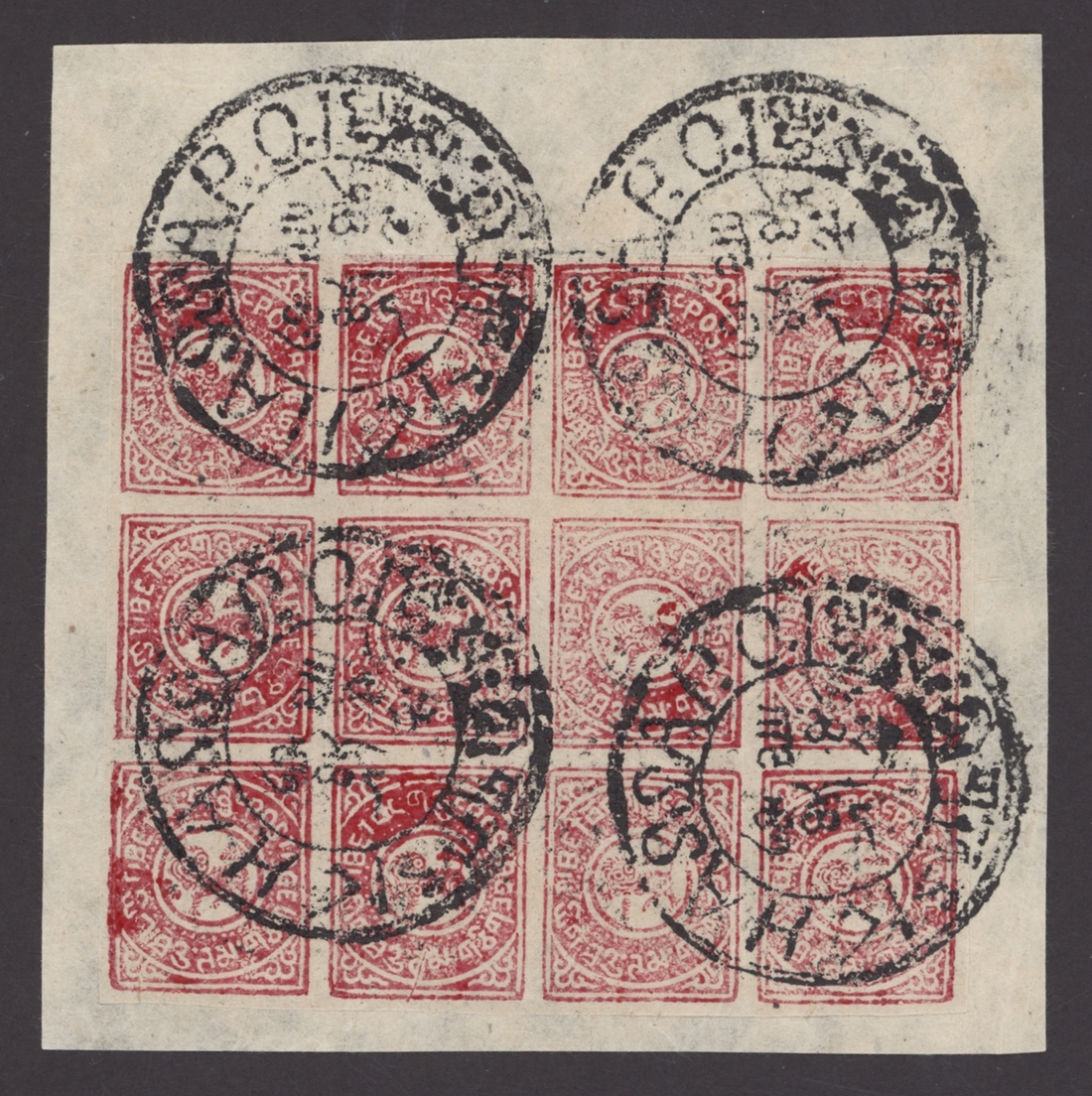 1tr. carmine-red, shiny printing, a complete sheet of twelve tied on piece by Lhasa type II postmark; some creasing. Waterfall 78. Photo
