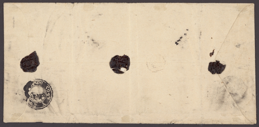 1914 (c.) old On His Majesty's Service envelope (crossed through) registered to Gyantse bearing pair of 1/3 tr. milky blue tied by Lhasa type 1 postmark with a superb strike of Lhasa I registration handstamp and Nangartse transit postmark in black alongside with date insertion and, on the reverse, Gyantse arrival, with three black wax seals (broken in places). Folding creases and soiling. Pays 1/6 tr. postage plus ½tr. registration. Photo