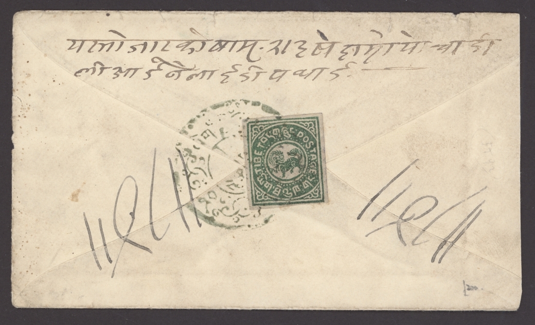 1914 (c.) envelope bearing, on the reverse, 1/6 tr. green well tied by a very fine strike of Shigatse type I fretwork postmark in green; some light soiling. A good cover. Fortune Wang records only three examples. Photo