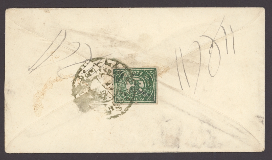 1914-15 (c.) envelope to Lhasa bearing, on the reverse, 1/6 tr. deep green tied by a fair to good strike of Shigatse type 1 postmark in yellowish green; the address written in both Nepalese and Tibetan. A good cover. This rare postmark is not in the blue-green as recorded by Waterfall. Photo