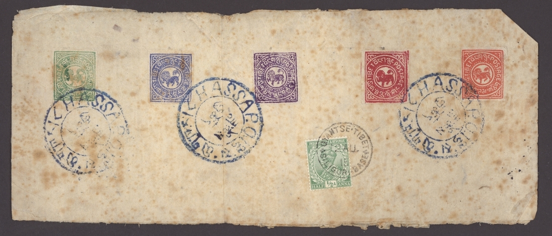 1915 (Aug.) handmade paper envelope addressed in Tibetan bearing, on the reverse, the set of five values in some of the earlier shades, tied by the large Lhasa type II postmark in blue, alongside India K.G.V ½a. green tied by "