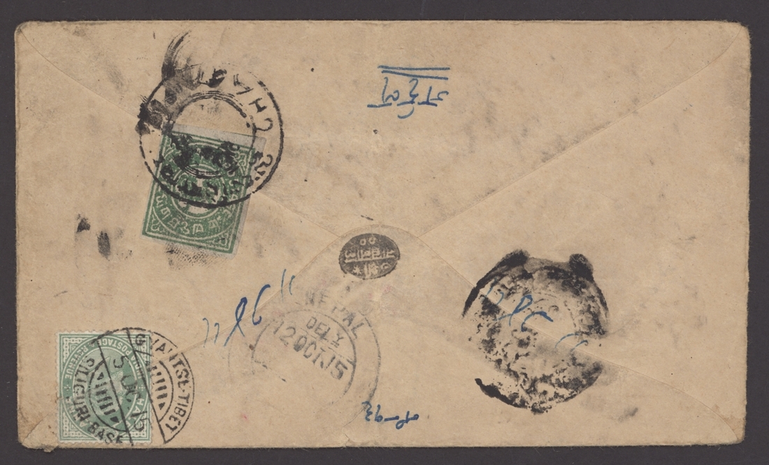 1915 (Oct.) envelope to Nepal bearing, on the reverse, 1/6 tr. green tied by Lhasa type IV postmark, with indistinct Gyantse type I, India K.E.VII ½a. tied by "