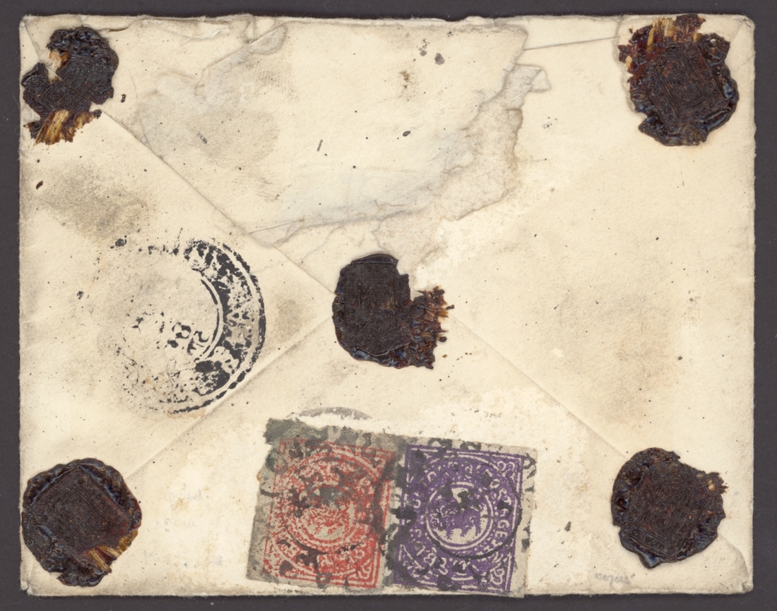 1916 (c.) commercial envelope registered to Nangartse bearing, on the reverse, ½tr. violet and 1tr. vermilion tied by light strikes of Lhasa postmark with a fair strike of Nangartse type I alongside, with five red wax seals, the address side with a good strike of Lhasa type II registration handstamp; there is some damage to the flap and scuff marks around the adhesives, apparently where the gum has been scraped off. A very scarce franking. Photo