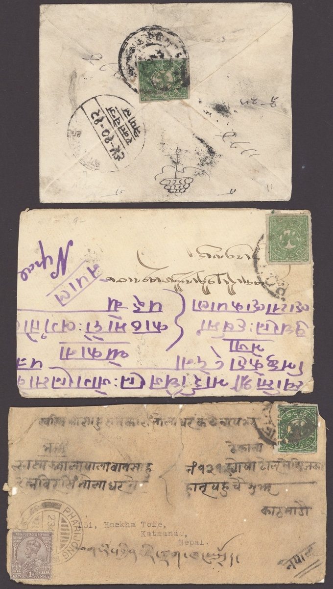 1922-26 a group of covers relating to Nepal bearing 1/6 tr. in shades of pale emerald, dull yellow-green and olive-green with the appropriate India adhesives, two from Nepal and two to Nepal from Lhasa; condition mixed, one is poor. Also 1933 India 1a. stationery envelope to Nepal, cancelled Pharijong and bearing, on the reverse, 1/6 tr. bottle green tied by Phari postmark and showing a good strike of Nepalese Exchange P.O. of Katmandu. (5 covers)