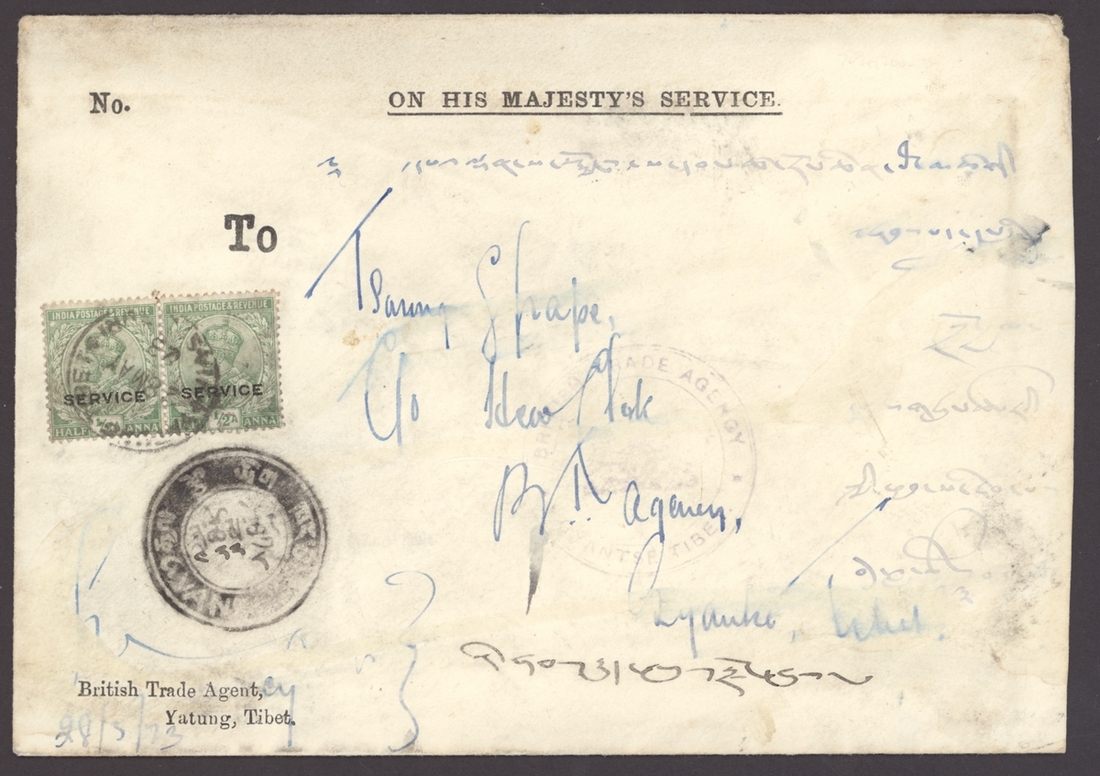 1923 (May) British Trade Agency OHMS envelope from Yatung to Gyantse bearing, on the reverse, 1/6 tr. dull yellow-green tied by a good strike of Gyantse type I postmark with manuscript insertion and with "
