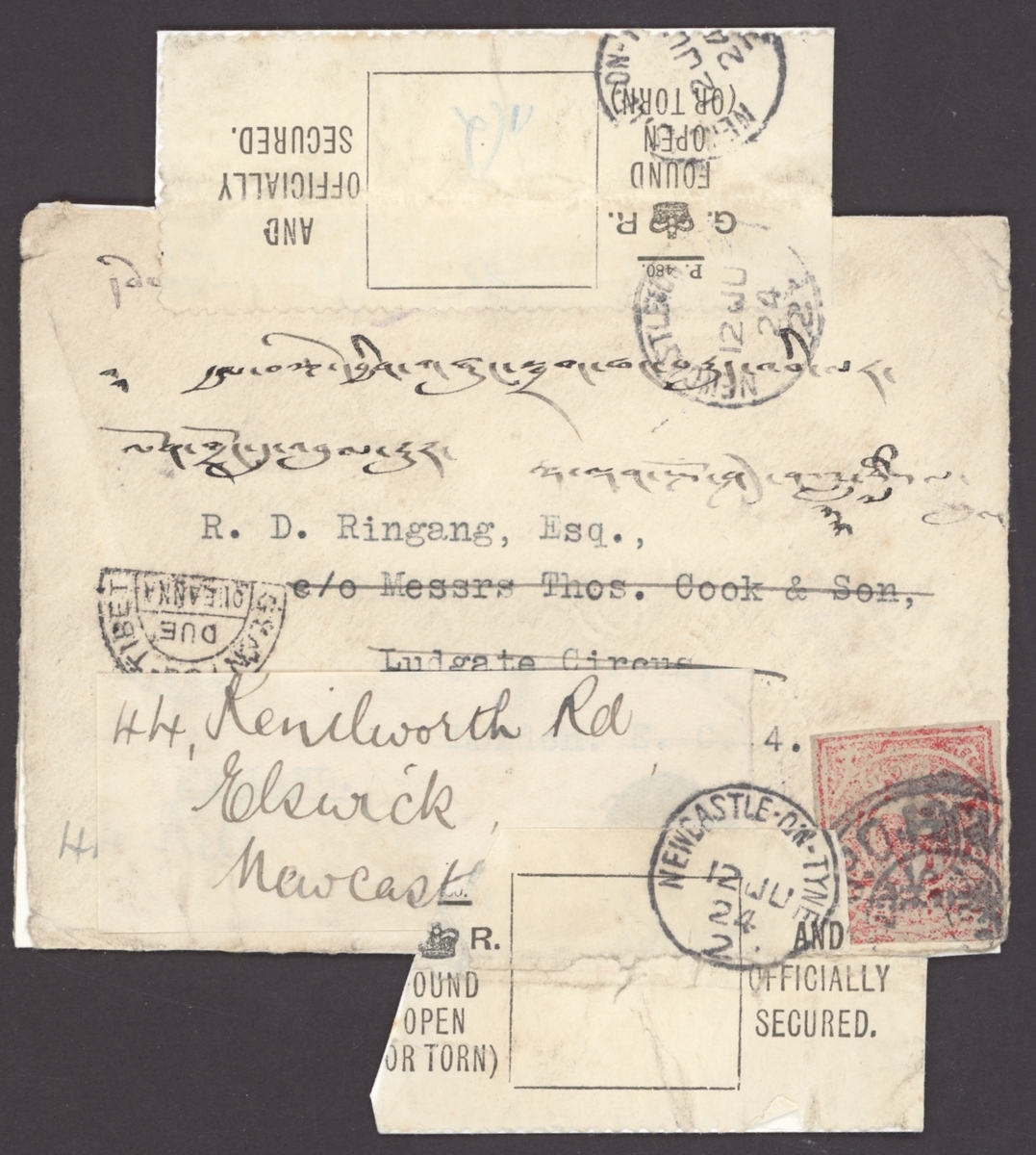 1924 (May) characterful envelope to Thomas Cook & Sons, London bearing 2/3 tr. rose-carmine (shiny print) cancelled by part Lhasa postmark and showing a fine strike of "