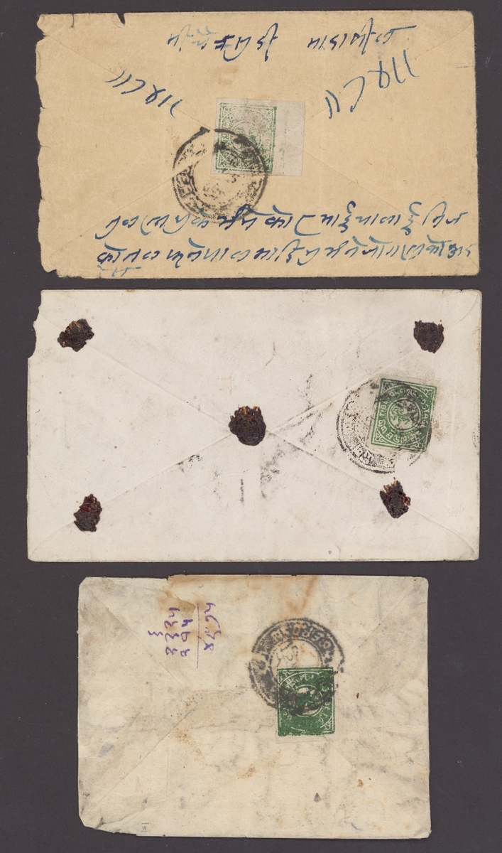 1924-26 (c.) a group of covers cancelled by Gyantse type 1 postmark bearing, on the reverse, 1/6 tr. apple green (smudged printing), 1/6 tr. olive-green and 1/6 tr. pale olive-green (with side margin); usual fair condition. (3 covers)