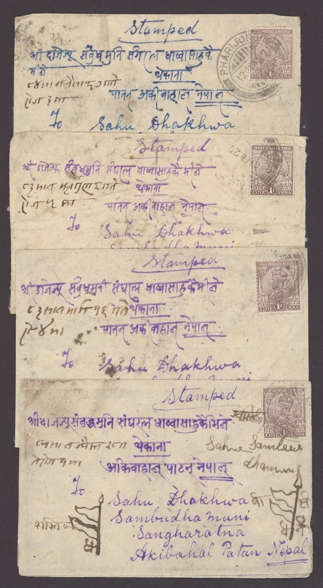 1926-28 a group of covers to Patan Akibahal, Nepal from the same commercial correspondence, each bears, on the reverse, 1/6 tr. in shades of green and pale green tied by Lhasa postmarks with Nepal c.d.s. and Katmandu in oval, the address side with India 1a. tied by Pharijong c.d.s. (4 covers)