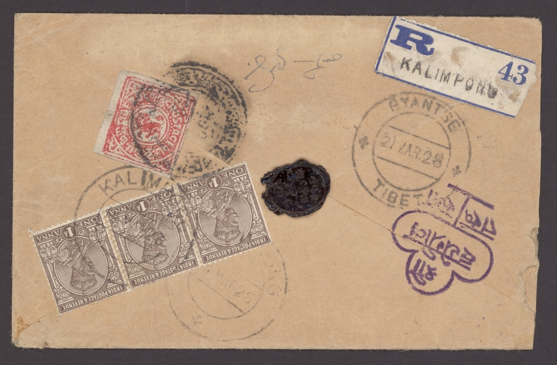 1928 (14 Mar.) envelope registered to Gyantse bearing, on the reverse, India K.G.V 1a. strip of three tied by Kalimpong c.d.s. with Kalimpong registration label at side, used with 2/3 tr. rose-carmine tied by Gyantse type I postmark with Gyantse British P.O. c.d.s. (21.3) and the sender's handstruck device in purple. A good franking paying registration ½tr. Photo