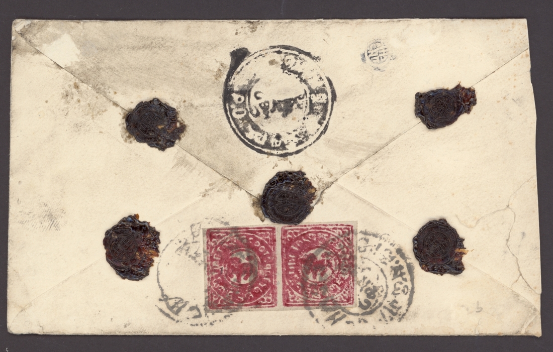1928 (c.) envelope insured to Gyantse bearing, on the reverse, a horizontal pair of 2/3 tr. bright lake tied by Lhasa type V postmark with Gyantse type I arrival alongside; with five small wax seals. One stamp with "