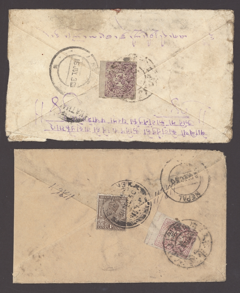 1929-33 a group of 2/3 tr. covers to Nepal with 1929 bearing 2/3 tr. bright rose-pink tied by a good strike of Lhasa postmark with Nepal (29.3) and Katmandu in oval alongside, the address side with India 1a. tied by Pharijong c.d.s., a fine and attractive cover; 1930-33 three similar covers but bearing 2/3 tr. purplish lake, condition is a little variable. (4 covers)
