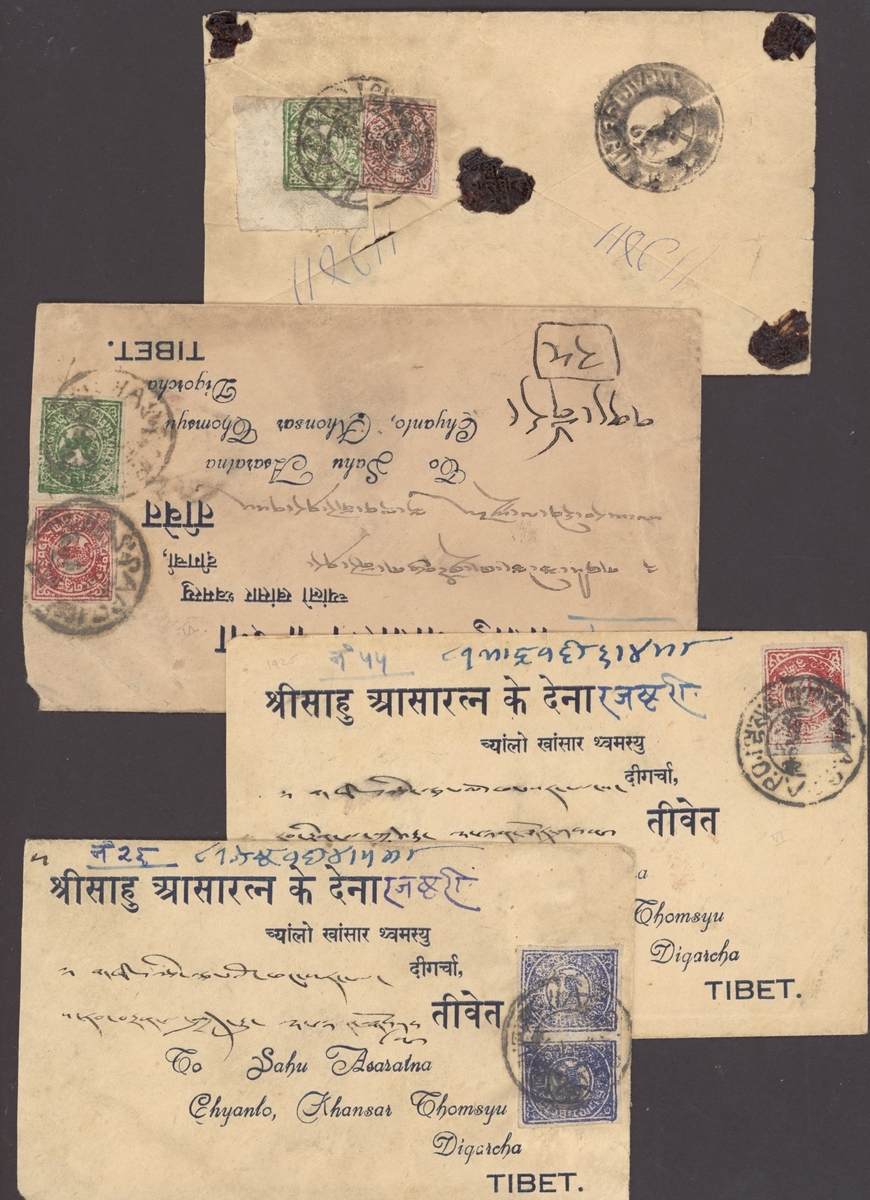 1930 (c.) four printed envelopes registered to Sahu Asaralna, Digarcha bearing ½tr. dull grey-blue pair tied by Lhasa postmark, 2/3 tr. bright rose-carmine tied by Lhasa postmark, 1/6 tr. yellow-green with 2/3 tr. bright rose-pink ("