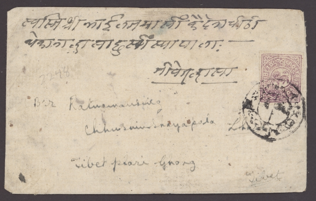 1932 (15 Sept.) envelope to Pharijong bearing, on the reverse, India 3p. and 1a. tied by Nepal c.d.s. with similar Pharijong transit (21.9) alongside, the address side bearing ½tr. grey-lilac tied by Phari type 1 postmark. A good cover