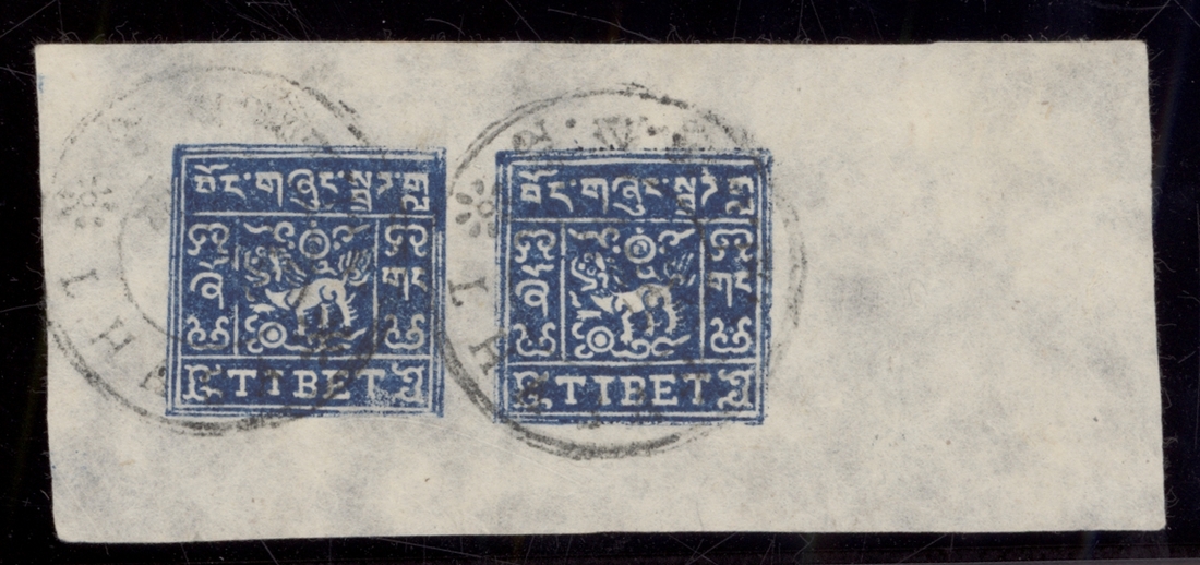 2/3 tr. dark blue sheetlet of two, clichés 5 and 3; cancelled by favour by Lhasa postmark; fresh and fine. Photo