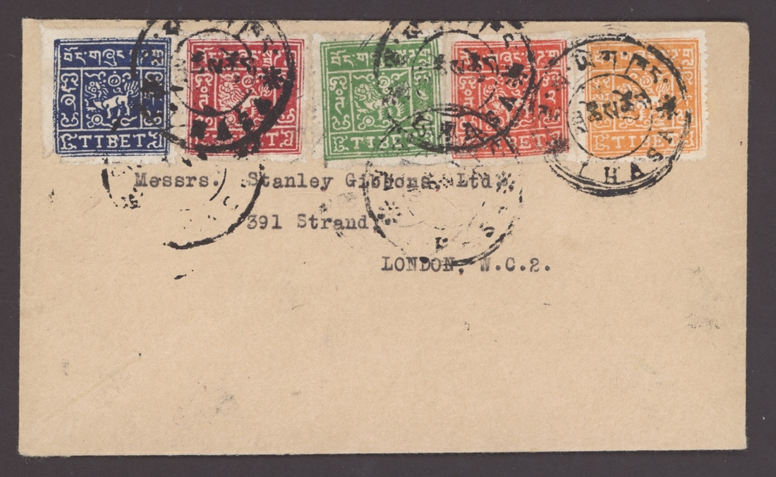 1933-34 (c.) buff envelope to Stanley Gibbons in London bearing perforated ½tr. orange, 2/3 tr. dark blue, 1tr. carmine-red, 4tr. yellow-green plus imperf. 2tr. scarlet tied by Lhasa type T42 postmark with the double outer ring. Photo