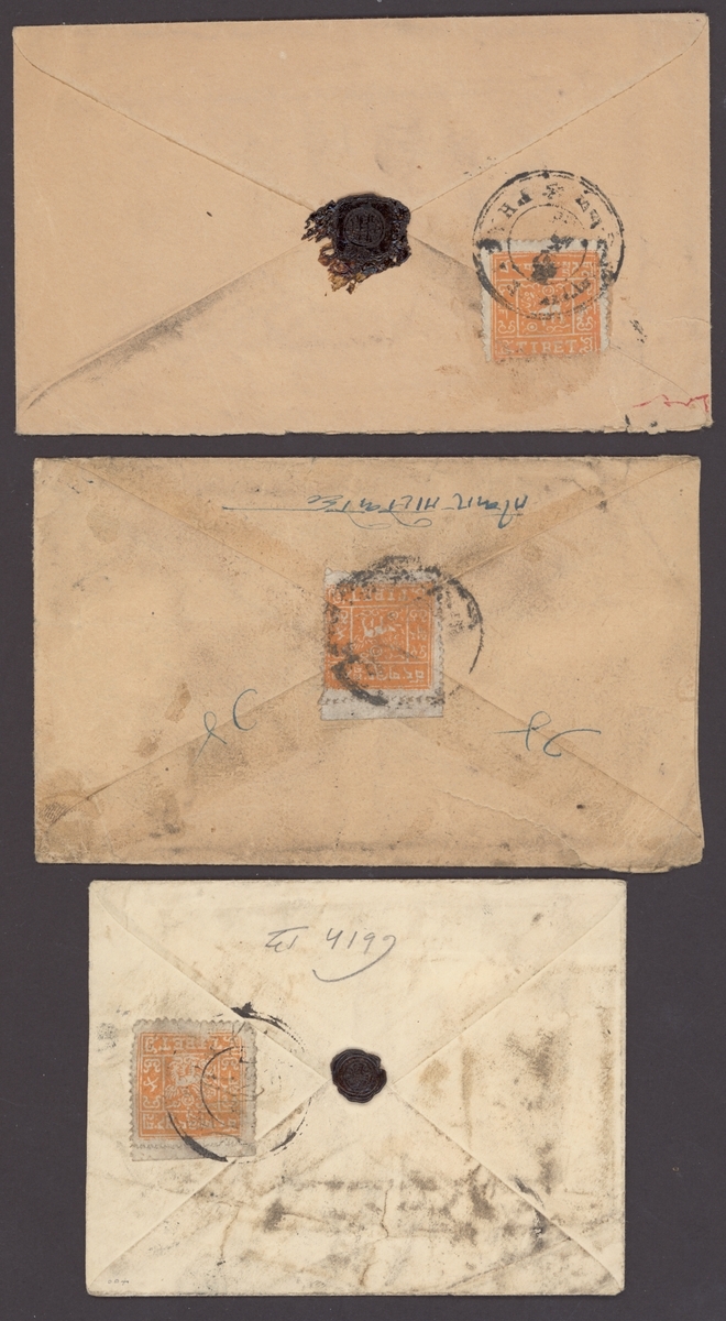 1933-35 (c.) three internal covers bearing, on the reverse, perforated ½tr. orange tied by Phari and other, indistinct, postmarks; mixed condition. (3 covers)