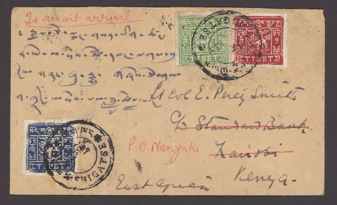 1935 (Sept.) envelope to Kenya bearing 1tr. carmine-lake, 4tr. emerald with imperf. 2/3 tr. Prussian blue tied by Shigatse type 2 postmark, the reverse with India K.G.V 2a. pair tied by Gyantse/Tibet c.d.s. (5.9) and Nairobi arrival (28.9); vertical fold, fine and a scarce destination. Photo
