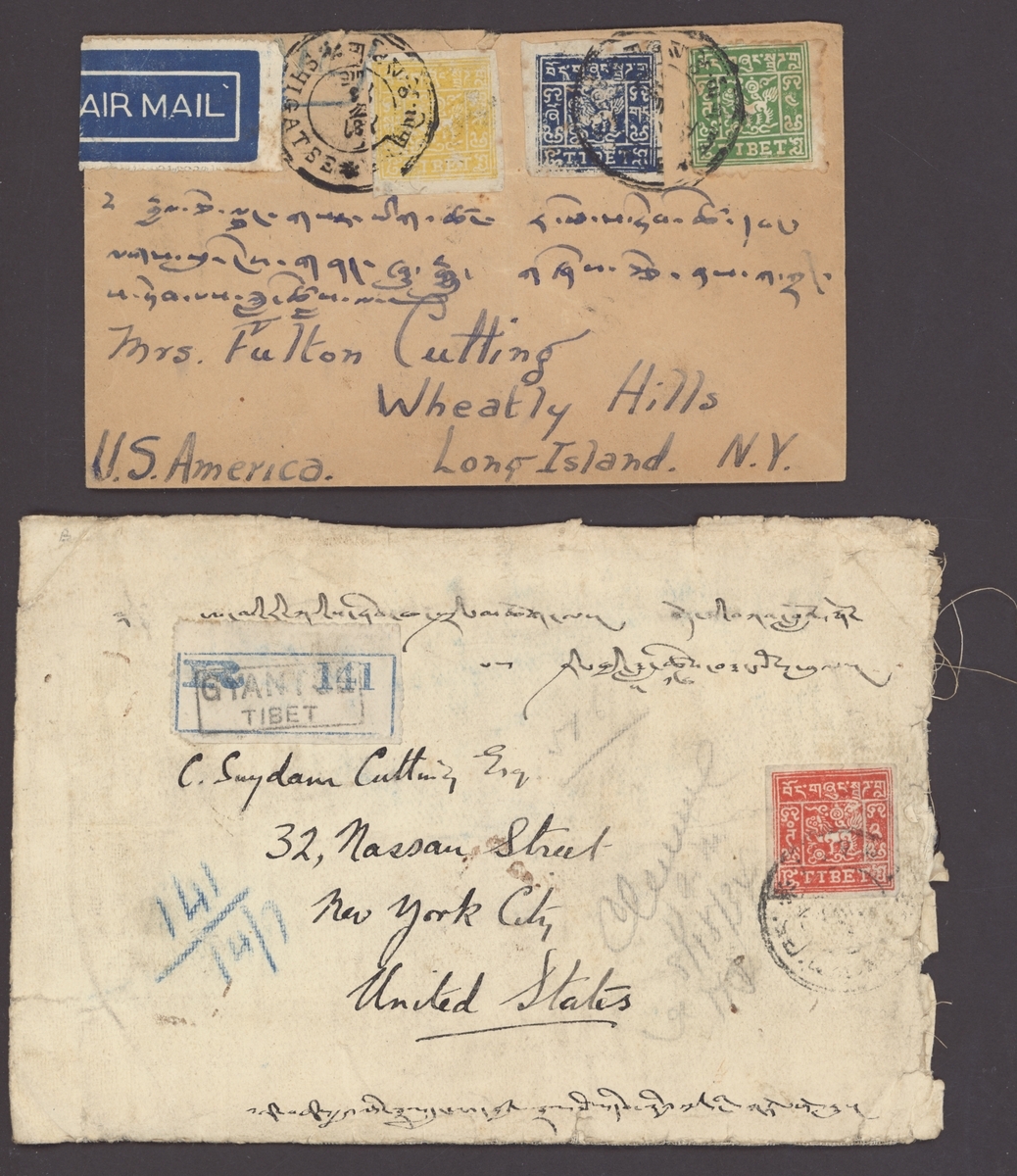 1935 (Sept.) Cutting envelope sent air mail to New York bearing 4tr. emerald with imperf. ½tr. pale yellow and 2/3 tr. Prussian blue tied by Shigatse type 2 postmark, the reverse with India 11½a. franking tied by Gyantse/Tibet (5.9) c.d.s.; also 1934 (July) large Cutting envelope registered to New York bearing 2tr. pale scarlet-vermilion tied by Lhasa postmark with Gyantse registration label, the reverse with India 6½a. franking tied by Gyantse/Tibet c.d.s. (14.7) with New York arrival (18.8); some creasing or wrinkling. (2 covers)
