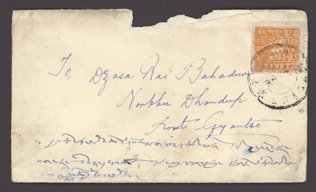 1935 (c.) envelope to Rai Bahardur Norbhu (clerk to the British Political Officer) in Gyantse bearing ½tr. yellow-orange tied by a light strike of Lhasa postmark, the reverse bears five black wax seal featuring a knot design with dot and crescent above, there is also a superb impression of this seal struck in black ink; a little roughly opened at top, otherwise a good cover. Photo