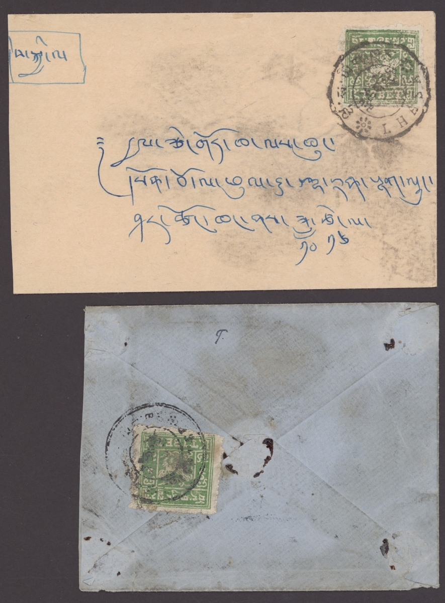 1942-45 two internal registered envelopes bearing perforated 4tr. yellow-green or olive-green tied by Gyantse or Lhasa postmarks; apparently private perforations and paying 3tr. postage plus 1tr. registration; one cover soiled. (2 covers)
