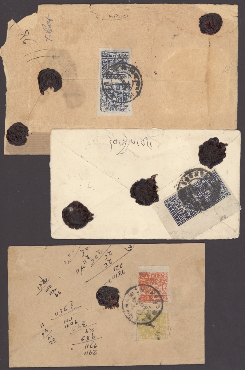 1933-35 (c.) a group of registered covers two bearing vertical pairs of 2/3 tr. dark blue cancelled by either Lhasa or Gyantse postmarks, also envelope bearing ½tr. pale yellow and 1tr. pale scarlet-vermilion tied by Gyantse postmark; condition is variable. (3 covers)