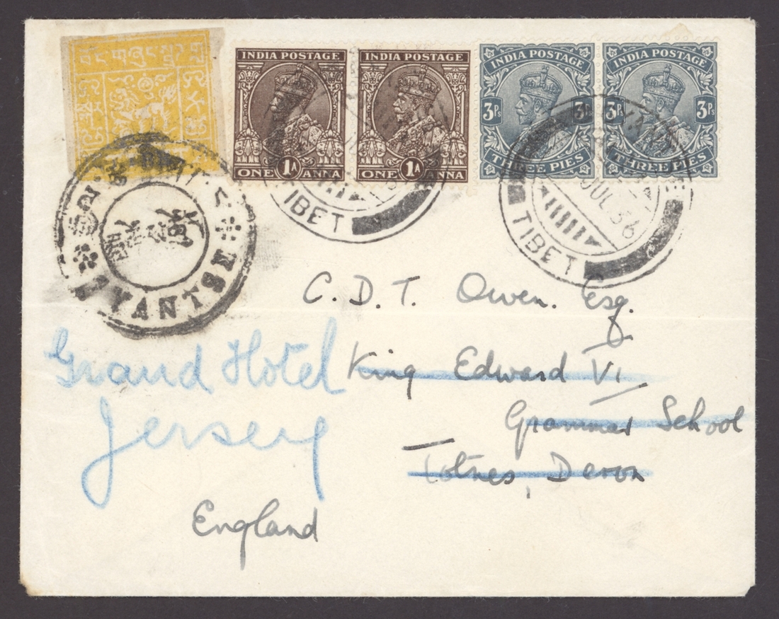 1936 (July) envelope to Devon, redirected to Jersey, bearing Tibet ½tr. pale yellow tied by a fine strike of Gyantse postmark, with India K.G.V 3p. pair and 1a. pair tied by Gyantse/Tibet c.d.s., the reverse with Bournemouth machine postmark (25.8). A clean cover