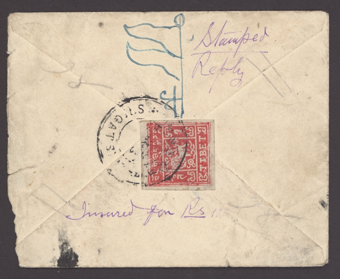 1936 (c.) commercial envelope bearing, on the reverse, 1tr. rose-carmine tied by a good strike of Shigatse type 2 postmark and marked "Insured for Rs 10". Unusual as extra payment would be expected for insurance