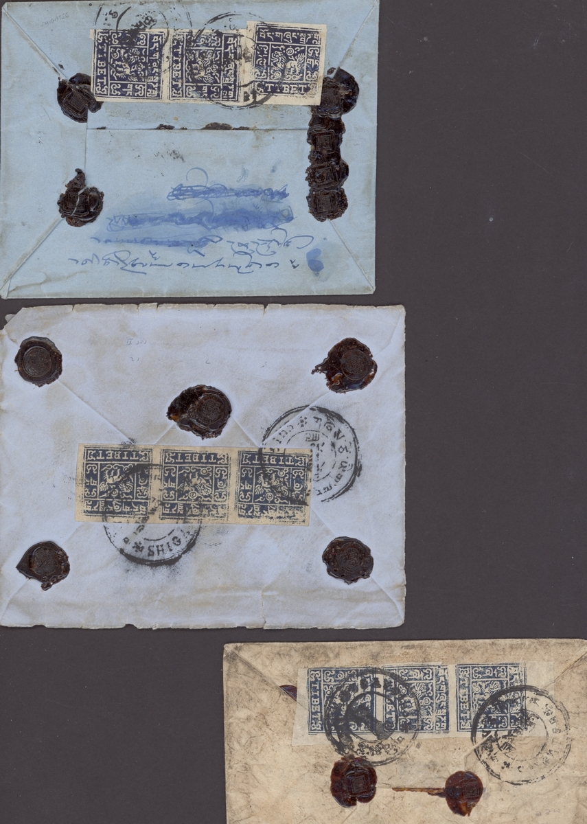 1936-37 (c.) a group of registered covers (one back), each bearing three 2/3 tr. frankings tied by Shigatse or Gyantse postmark; condition is mixed. (3 covers)